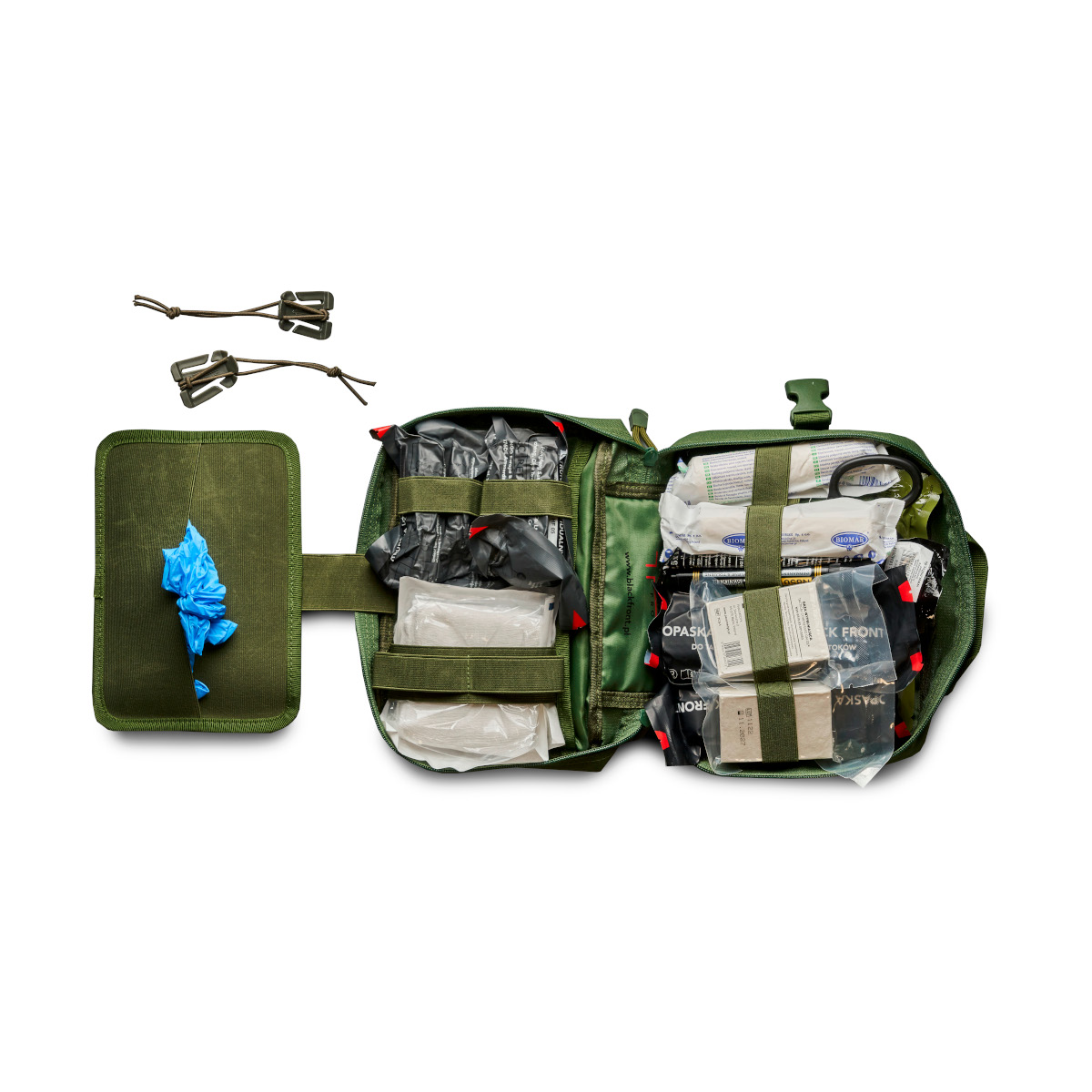 Saszetka Trauma Responder (TR) to futerał zaprojektowany na rozbudowane apteczki pierwszej pomocy, wyposażone w produkty medyczne gotowe do użycia względem większej ilości osób. Mimo niewielkich rozmiarów, produkt jest bardzo kompaktowy i mieści dużą ilość wyposażenia, co sprawia, że stanowi ciekawą alternatywę dla podręcznych toreb opatrunkowych. Konstrukcja zapewnia natychmiastowy i intuicyjny dostęp do całego wyposażenia. W środku można znaleźć wiele kieszeni dedykowanych na opatrunki, liczne gumy z podwójnymi przeszyciami o różnym rozstawie, kieszeń z przeźroczystym oknem na drobne wyroby (np. plastry, paski do zamykania ran itp.) czy też specjalne miejsce dedykowane na rękawiczki. Wszystko to sprawia, że użytkownik ma szerokie możliwości na dowolną konfigurację wyposażenia według własnych preferencji. Tylna część saszetki posiada zrywalny panel z systemem mocowania typu MOLLE, dzięki czemu można ją zamontować w prosty i szybki sposób na innym, przystosowanym do tego ekwipunku. Na przodzie saszetki znajdują się również tzw. laser cuty w systemie MOLLE. Można na nich zamontować najbardziej potrzebne produkty np. nożyczki, opaskę zaciskową itp. za pomocą troków szybkiego montażu, które są na wyposażeniu w ilości 2 sztuk. Produkt posiada gumową plakietkę z krzyżem, który jest międzynarodowym symbolem dla zestawów apteczkowych.